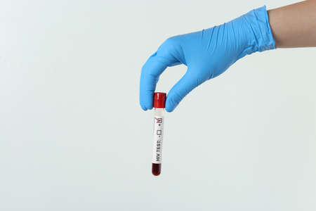 Scientist holding tube with blood sample and label HIV Test on light background, closeup