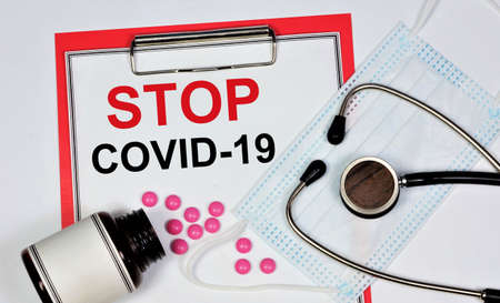 Stop COVID 19. An inscription on the background of a protective medical mask, a stethoscope and medicines. Prevention by hygiene and social distance.