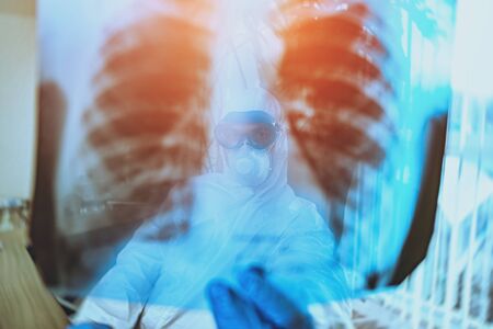 Pulmonologist in goggles and mask looks at x-ray of lungs in clinic. X ray diagnostics of lung diseases during epidemic of coronavirus infection concept.