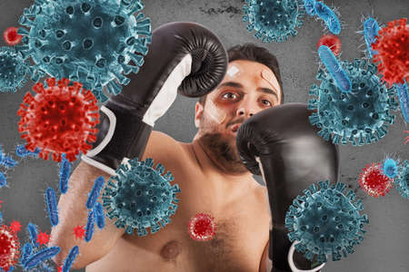 Man fights like a boxer. Concept of viruses and bacteria attack