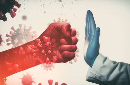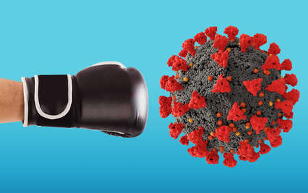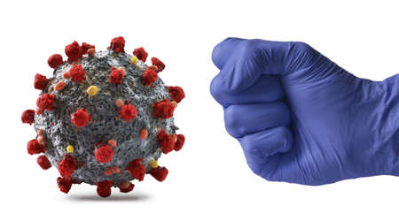 Medic glove hand punch the coronavirus molecule structure.