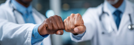 Doctors in rubber gloves touching their fists in clinic close-up. Health care workers cooperation concept