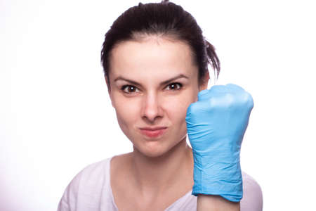 Hand , fist in blue latex Glove ready to punch. White background. Copy space