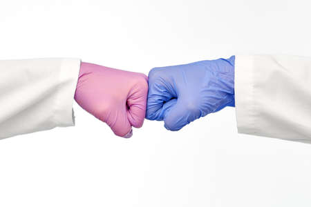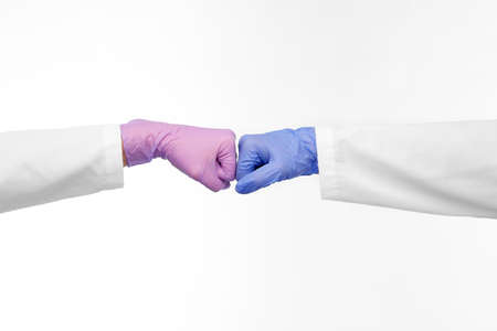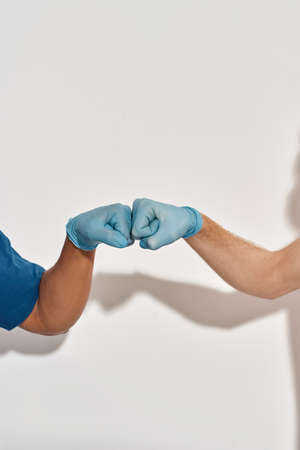 Close-up of hands in medical, latex, nitrile gloves, greeting hands in gloves with fists like colleagues.