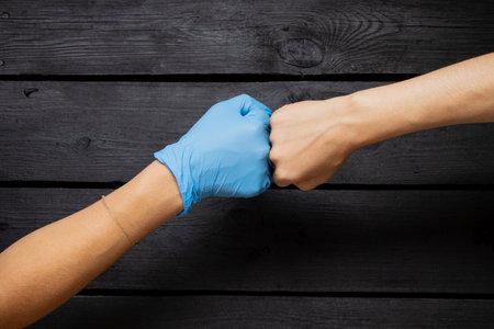 A hand in a blue medical glove and a female hand without a glove bump fists on a black wooden background
