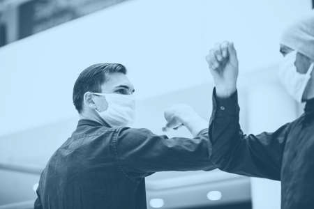 Business colleagues greeting with elbows during coronavirus pandemic. stock photo