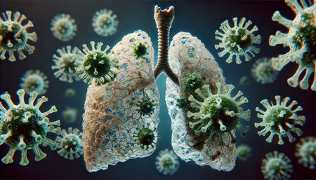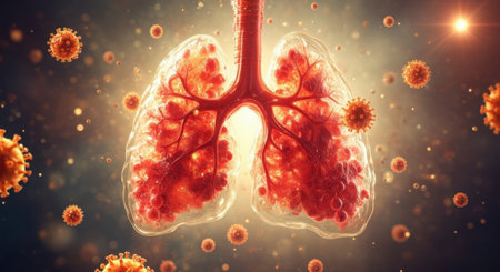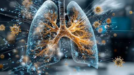 A detailed, glowing illustration of human lungs, appearing inflamed and surrounded by numerous microscopic virus particles.