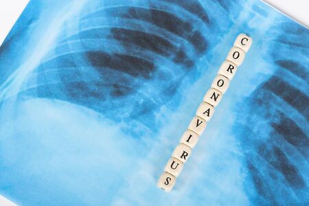 Novel Covid-19, virus concept . Text phrase Coronavirus with wooden letter on lungs radiology blue image background. Copy space.