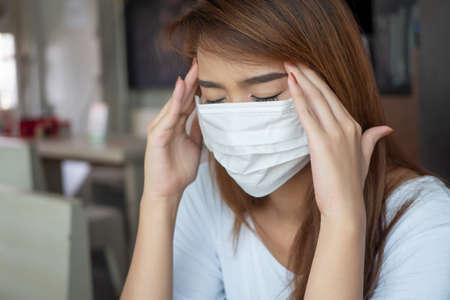 Stress, disturbing symptom, infection. Worried, desperate, frustrated woman in medical mask suffering from headache and pain. Concern, disquiet.