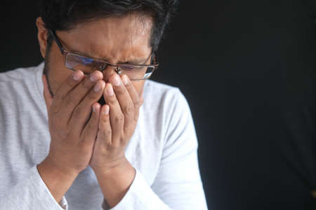 Youngman wear white T-shirt,2 hands touch his head , dismal feeling.
