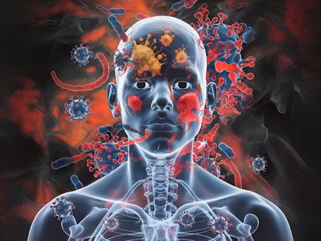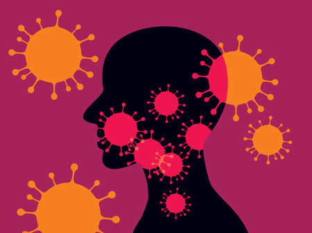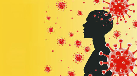 Silhouette of a head surrounded by red virus particles on a yellow background symbolizing infection and health concerns