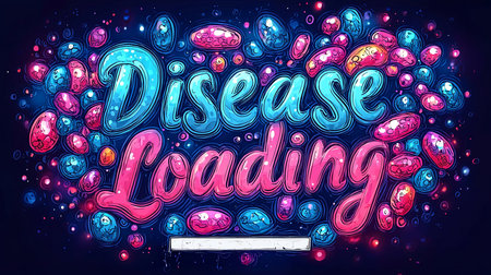 Dynamic digital illustration featuring the phrase 'Disease Loading' surrounded by vibrant, colorful pills. The artwork conveys a sense of urgency and health-related tension.