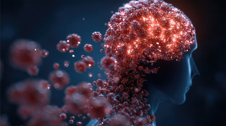 This image presents a human head silhouette with a striking visual representation of the brain. Red glowing particles emanate from the head, creating a sense of activity and complexity. The composition utilizes a shallow depth of field against a dark background. Suitable for illustrating concepts of neuroscience, research, or technology.