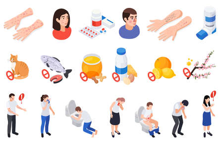 Set with isolated allergy symptoms treatment isometric icons of allergens and suffering people with aid medicine vector illustration