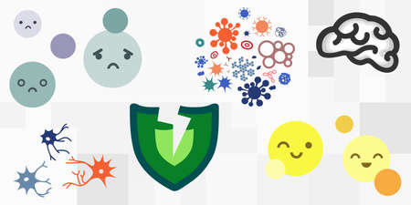 vector icons of brain neurons and protection shield from viruses for psychoneuroimmunology concept