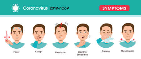 Coronavirus Symptoms vector illustration. Signals of Covid-19. Cough, Fever, Sneeze, Headache, breathing difficulties, muscle pain, flu, dypsnoea, runny nose, shaking chills. Basic symptoms of virus disease, coronavirus or sars
