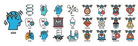 A collection of medical icons, including a heart, a skull, and a person with a blue head