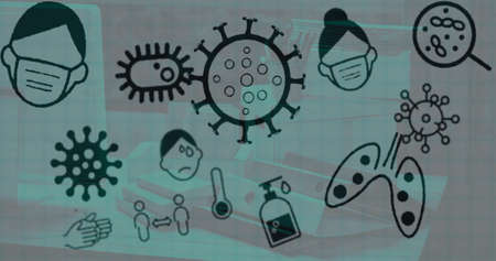 Image of multiple Covid 19 coronavirus icons moving over empty office in the background. Global coronavirus Covid 19 pandemic concept digitally generated image.