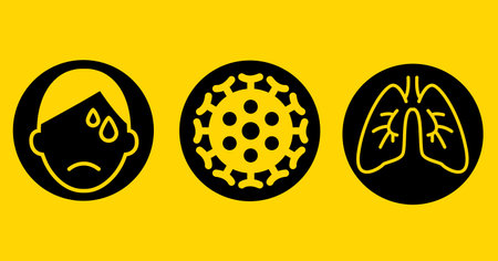 Digital illustration of a three black circles with unhappy face, cell of coronavirus Covid 19 and lungs on yellow background. Precautions self isolation breathing coronavirus Covid-19 pandemic concept digitally generated image.