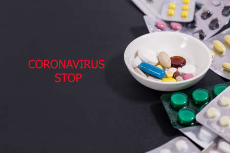 various medicinal pills and capsules on blurred background of chest x-ray