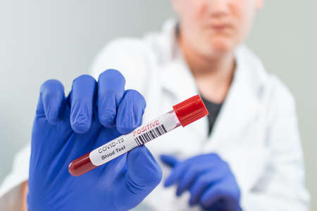 Doctor holding Coronavirus 2019-nCoV blood sample. Concept of vaccination, Covid 19 diagnostic. Diagnosis and laboratory. Scientist with positive coronavirus test. Detection virus infected. Pandemic.