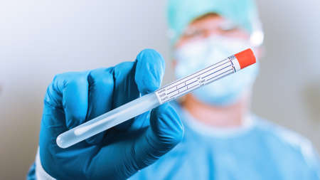 Virologist holding coronavirus swab test sample in a vial with gloves and face mask at laboratory. Close up