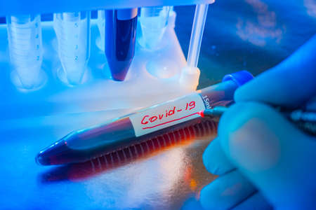 Coronavirus. Blood sample infected with caronovirus. Man signs a test tube. The inscription covid-19 on a test tube with blood. Pandemic research. Concept - covid virus research. Fever. Pneumonia