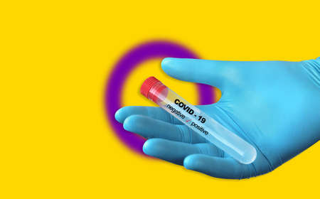 hand in medical gloves holding a blood test tube for corona virus analysis with result markers in front of a lab room