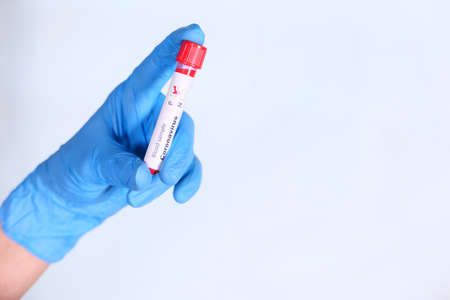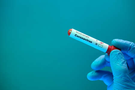 Blood positive test to coronavirus. Medical reseach, test-tube with blood, hand in latex medical gloves. Coronavirus outbreak and influenza. 2019-nCoV, covid-19, sars. High quality photo