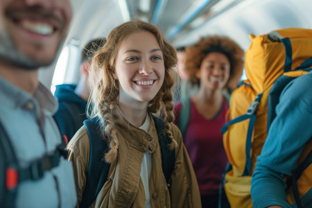 Cheerful, diverse group of travelers are shown with their backpacks, seemingly excited about their journey