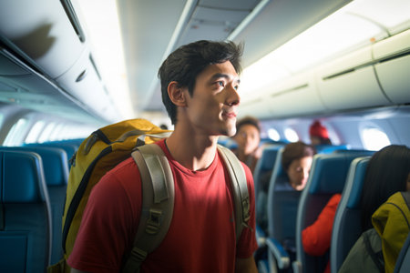male backpacker traveler passenger Smiling on the plane in front of the passenger seat bokeh style background