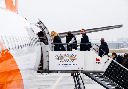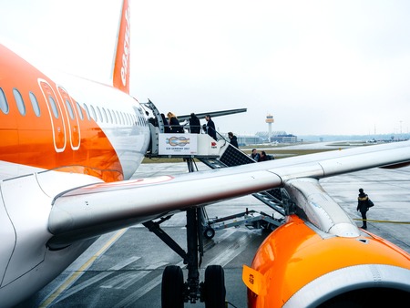 HAMBURG, GERMANY - MAR 22, 2018: People entering EasyJet airplane early in the morning in Flughafen Hamburg through rear passenger door jetway stairs G20 Germany 2017