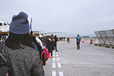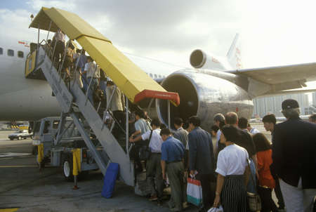 Honolulu - November 9, 2014: Line of People boarding Airplane down long ramp at Honolulu International Airport.
