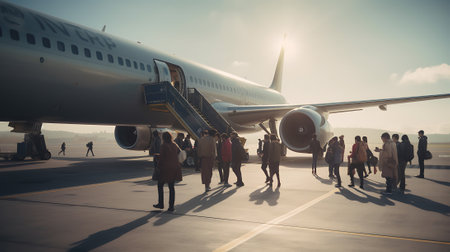excited tourists, as they board a commercial airplane parked on the airport runway. The scene brims with anticipation and the promise of adventure