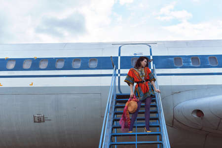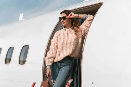 Woman passenger in sunglasses standing on airplane stairs at airport and looking away