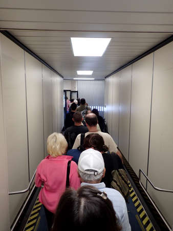 ROMANIA, BUCHAREST - MAY 14: Passengers boarding on airplane through a jetway on Otopeni International Airport on May 14, 2017.