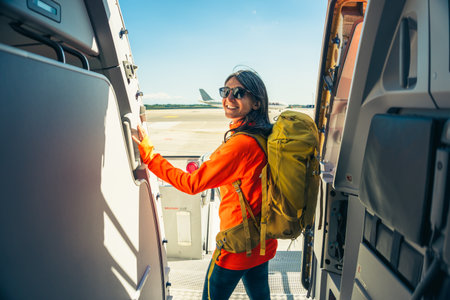 Young happy caucasian female traveler backpacker with carry on hiking backpack boarding airplane pose at aircraft entrance smiling, adventure tourism lifestyle, journey. Weekend trip get away Europe
