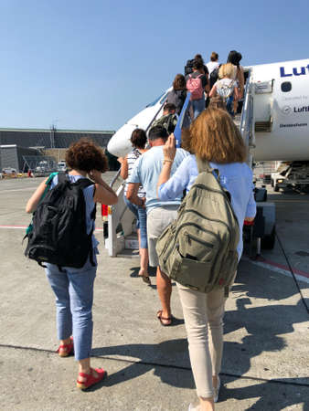 Brussels, Belgium - June 19, 2016: The people boarding the Brussels Airline aircraft. Passenger walking to the rear entrance of airplane