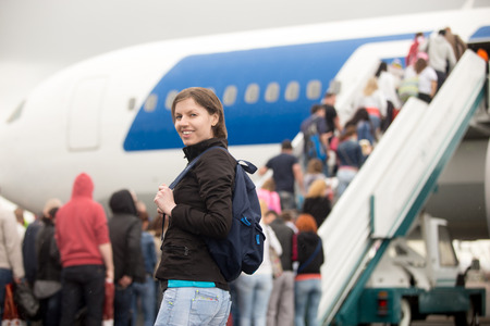 Young Caucasian happy smiling woman passenger in 20s travelling with backpack, boarding airplane, looking at camera, people climbing air stairs on background