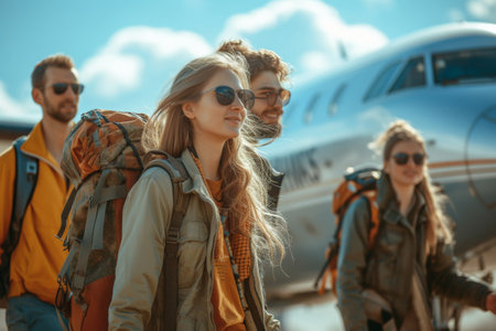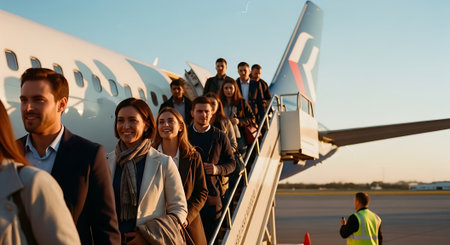 A group of travelers steps off a plane at sunset, creating a captivating scene at the airport runway. The mood reflects excitement and anticipation of new adventures.