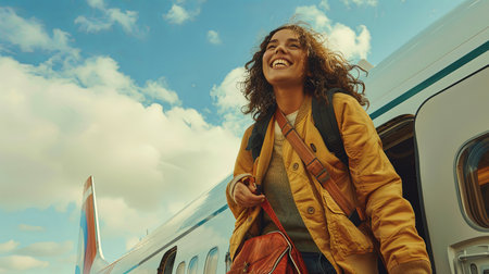 Happy young woman traveling on vacation with airplane boarding alone.