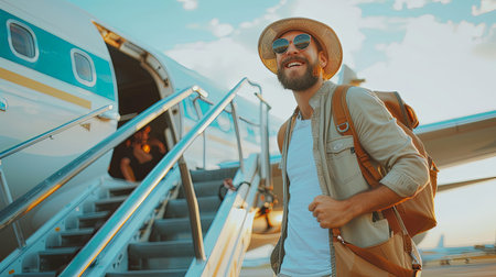 Young caucasian man boarding airplane going on vacation on a sunny day