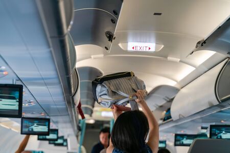 Hand take off hand luggage. Bag cabin on top shelf in airplane