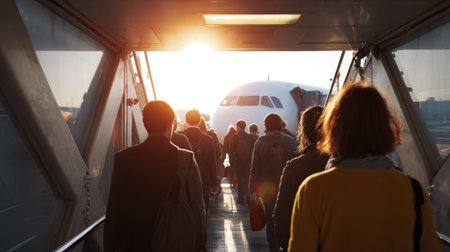 Travelers boarding airplane at sunrise: journey begins on airport jet bridge.