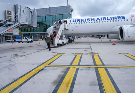 Arnavutkoy, Istanbul, Turkey - 03.11.2021: international and Turkish passengers with protective mask get off the airplane of Turkish Airlines in airdrome runway of Istanbul Airport in quarantine days