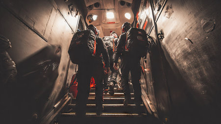 Military personnel unloading mysterious white bags from an airplane in a desert area, possibly during a secret mission or an emergency supply delivery in a remote location