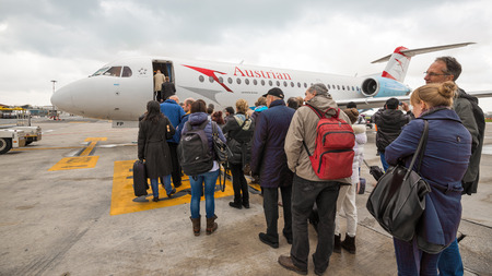 WIEN, AUSTRIA - MARCH 26, 2014 Boarding Austrian Jet airplane