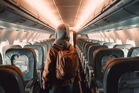 Back view of child walking through interior of airplane seats. Generative AI