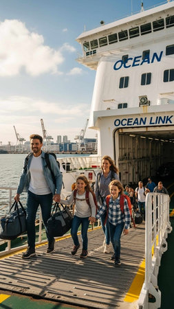 Commuters and tourists boarding a ferry at a modern pier in a bustling urban harbor