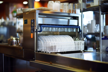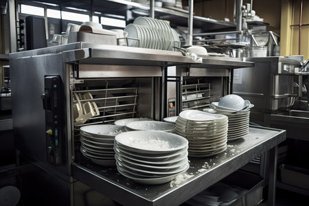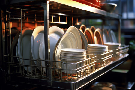 dishwasher with full load of dishes ready to be cleaned in industrial kitchen, created with generative ai